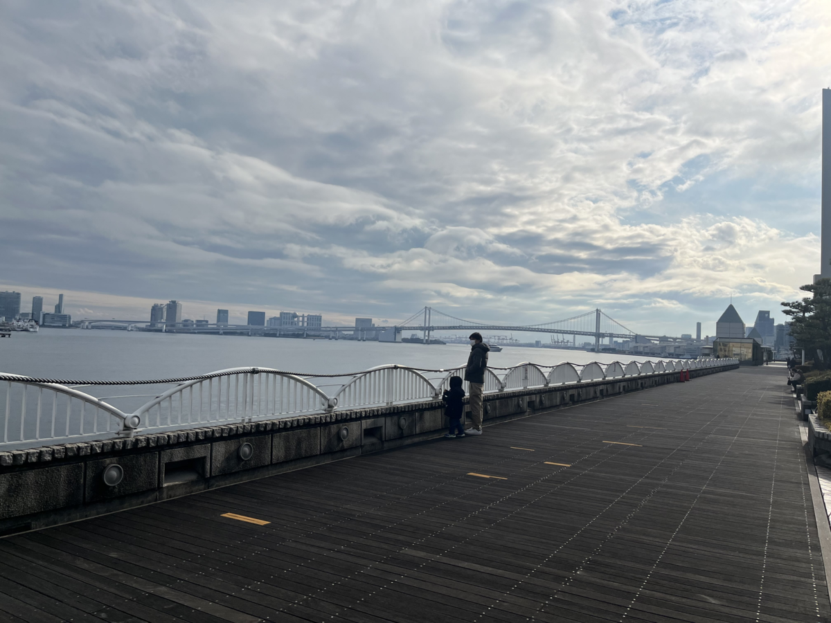 当日は、浜松町駅で下車。新しく整備された竹芝ふ頭歩行者デッキを通って、旧芝離宮恩賜庭園の横を海側へ歩いていくルートは、歩くだけでも気分が上がる爽やかな散歩でした。デッキからは新幹線が走る様子が見え、子供も大喜び。休日のためか、道中は人もまばらで、ゆったりとした時間が流れていました。